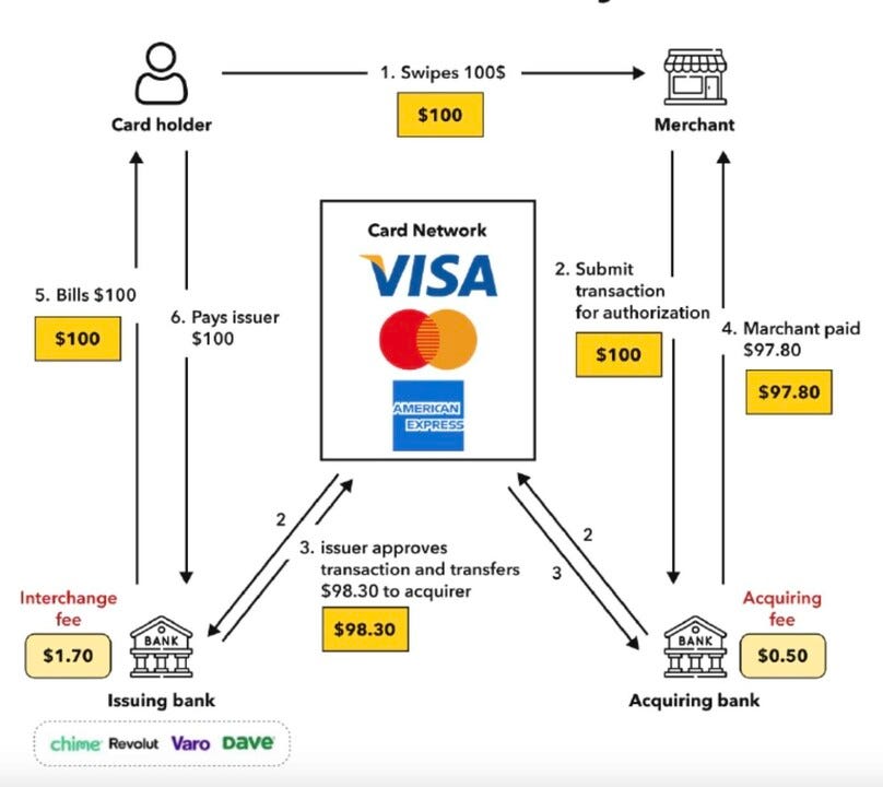 This diagram is only relevant in the US market22 which is largely unregulated23. For instance, Europe regulates this fee stack at 0.3% maximum on credit cards and 0.2% for debit cards24. Consumers might feel like everything is more expensive because of these fees but they actually get quite a bit in return. Consumer protections like charge backs and lack of liability for fraud on your card are hugely valuable25. Being able to take a piece of plastic/metal out of your pocket anywhere in the world and hand it to someone in exchange for good/services with basically no questions asked is actually pretty magical. There is value offered for these fees but they won’t stay this high forever.